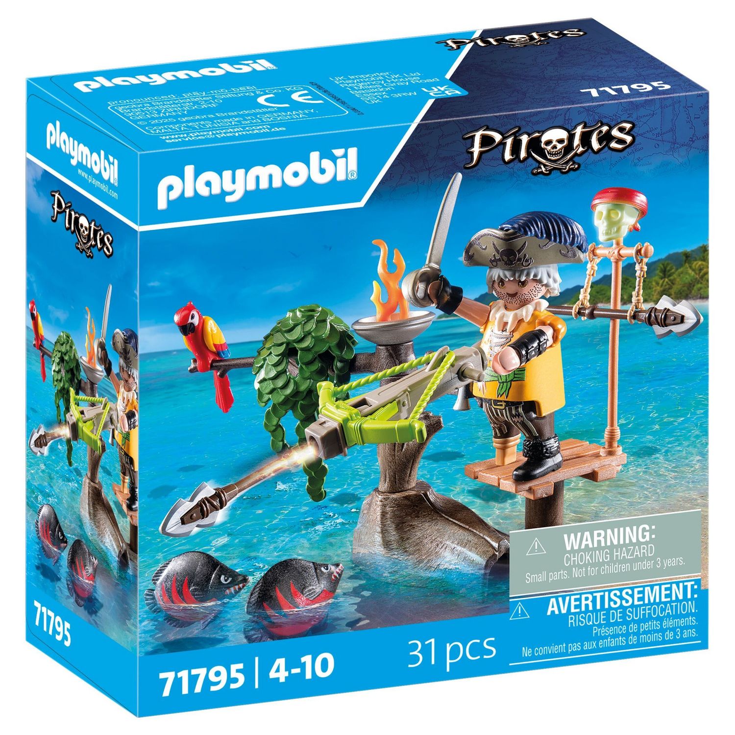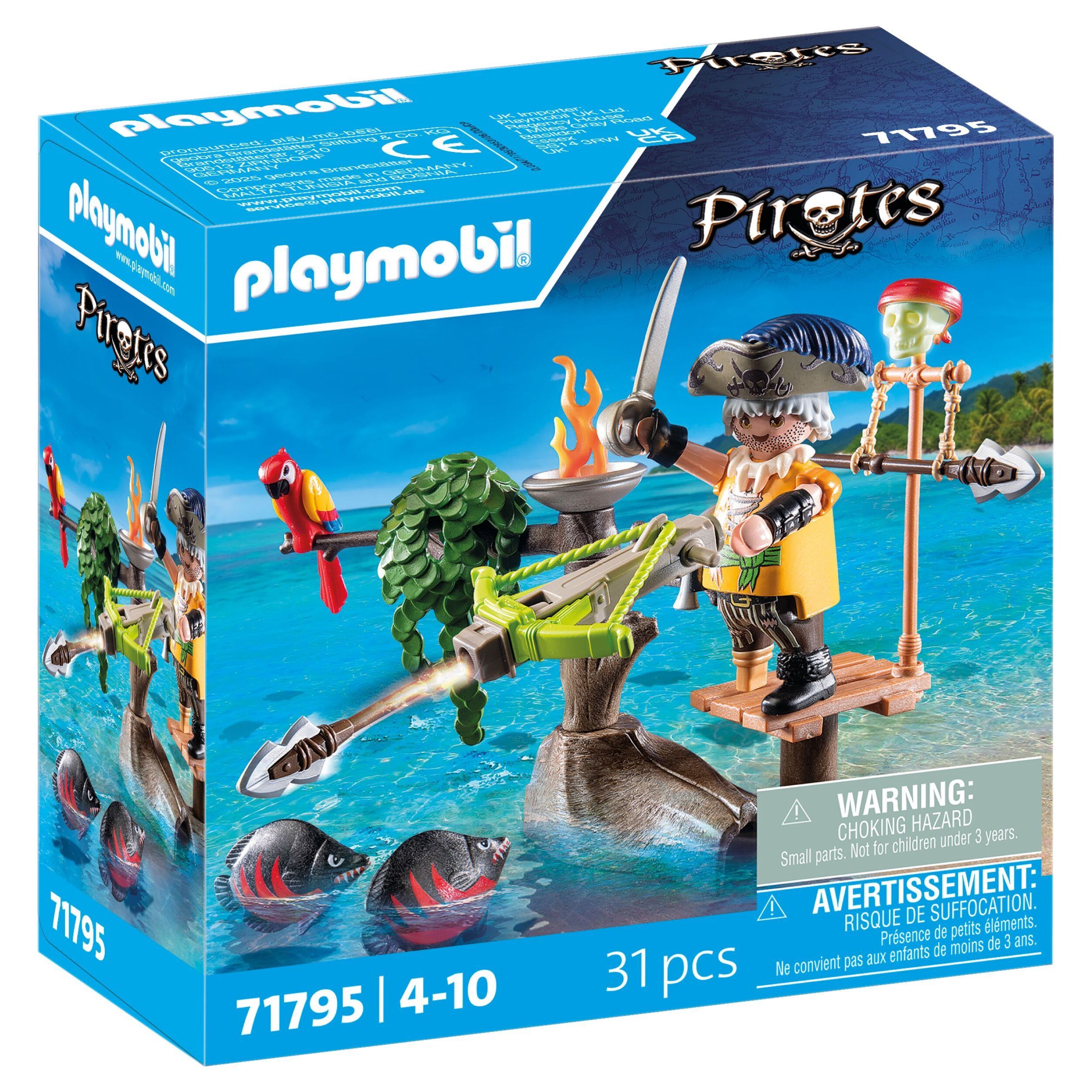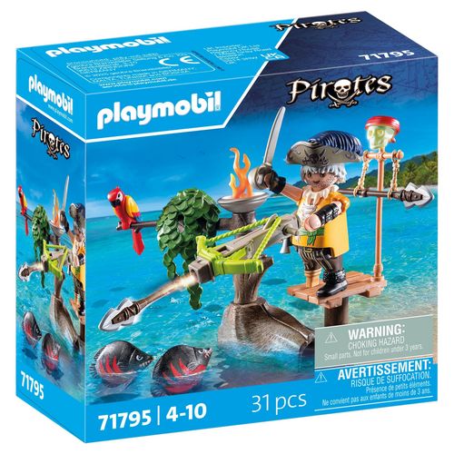 Le pirate, armé de son arbalète, se tient prêt à défendre son territoire contre les attaques des redoutables créatures marines. Comprend un personnage, une arbalète, deux poissons et des accessoires. Partez à l'aventure avec le set Pirate avec arbalète et poissons à viser PLAYMOBIL ! Le radeau flottant est équipé de canons pivotants, prêts à lancer des crochets ou des boules de feu pour repousser toute menace. Le trésor, gardé par un pieuvre redoutable, comprend un crâne en cristal étincelant et une couronne en or. Rangez des projectiles supplémentaires dans le tonneau et préparez-vous à des batailles en haute mer. Parfait pour des histoires créatives, ce set PLAYMOBIL offre des heures de jeu rempli d'action, tandis que le pirate intrépide affronte les dangers pour découvrir des richesses légendaires !