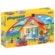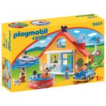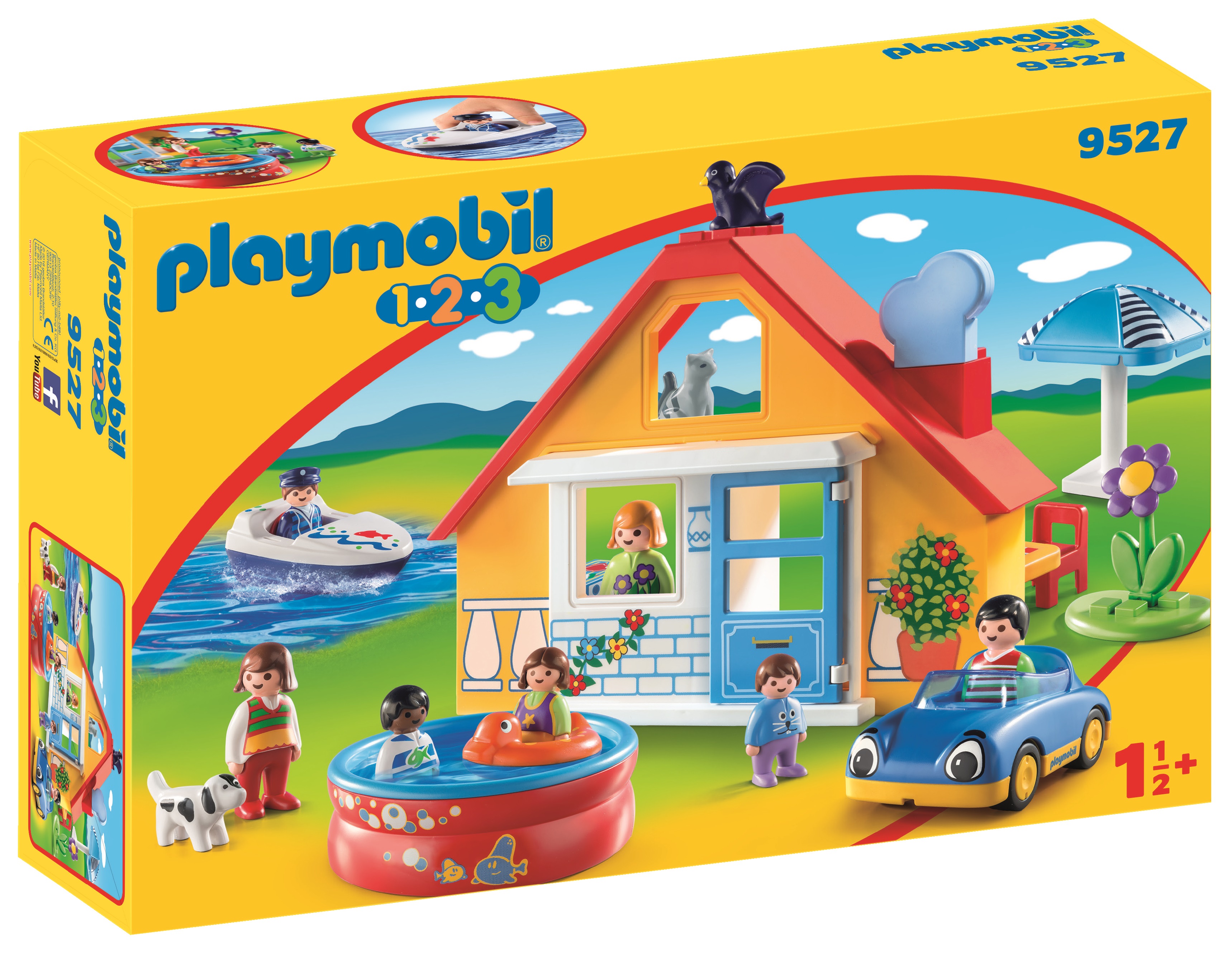 La famille Playmobil 1.2.3 est partie en vacances. Pendant que le papa fait une balade en bateau, la maman s'occupe des 3 animaux et les enfants profitent de la piscine. La famille se réunit dans la maison de vacances Playmobil 1.2.3 (9527) pour partager un bon repas et des bons moments. La gamme Pl