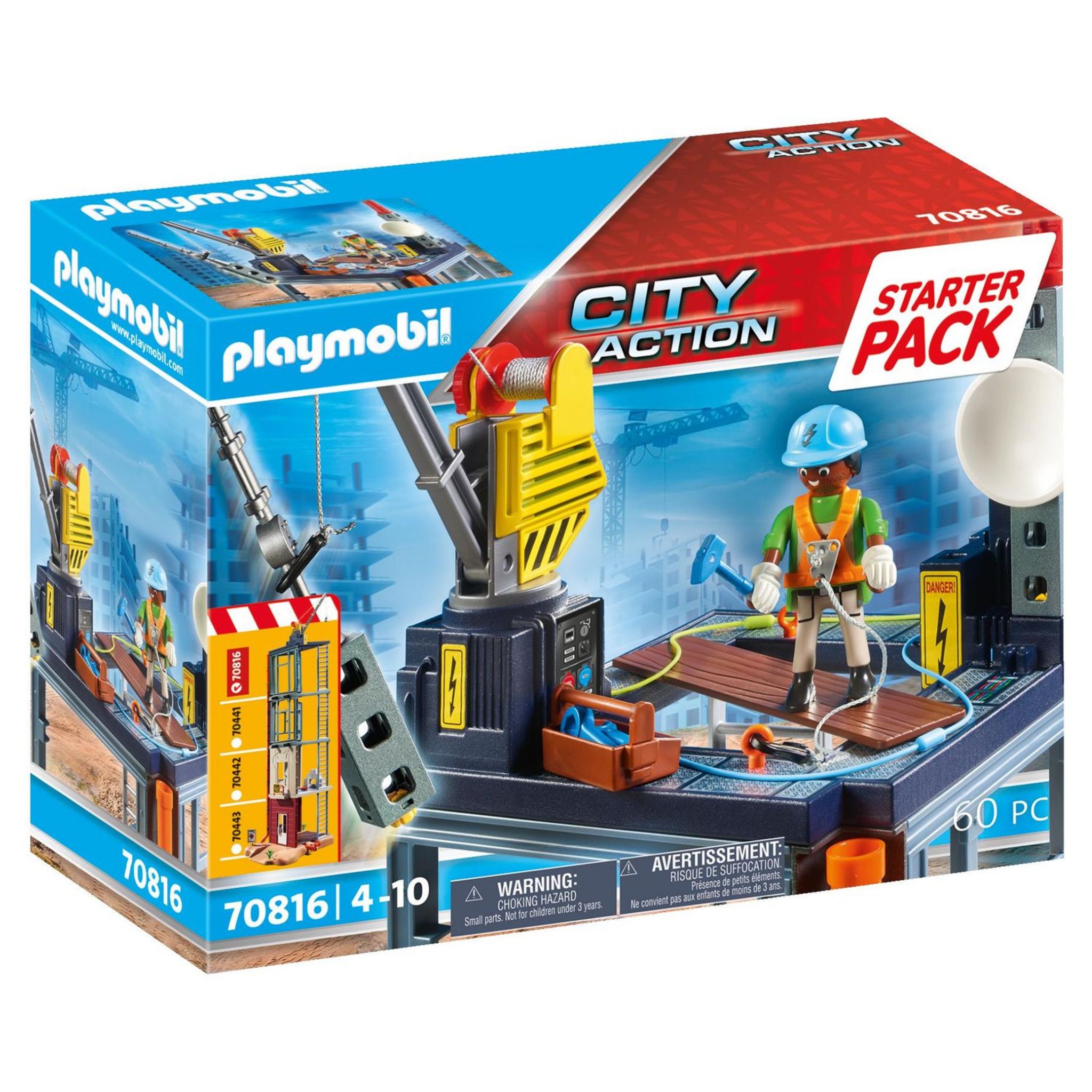 Un coffret pour découvrir un univers Playmobil ! La plateforme de construction permet à l'ouvrier de travailler sur le réseau électrique et de l'entretenir. La grue permet de soulever les matériaux du sol. Le starter pack Platerforme de construction peut être combiné avec les références 70442, 70443