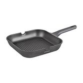 Poêle grill 28 x 28 cm en aluminium, tous feux dont induction. Design gris élégant, poignée fixe en bakélite. Revêtement antiadhésif intérieur, capacité 1,46 L. Non compatible lave-vaisselle.