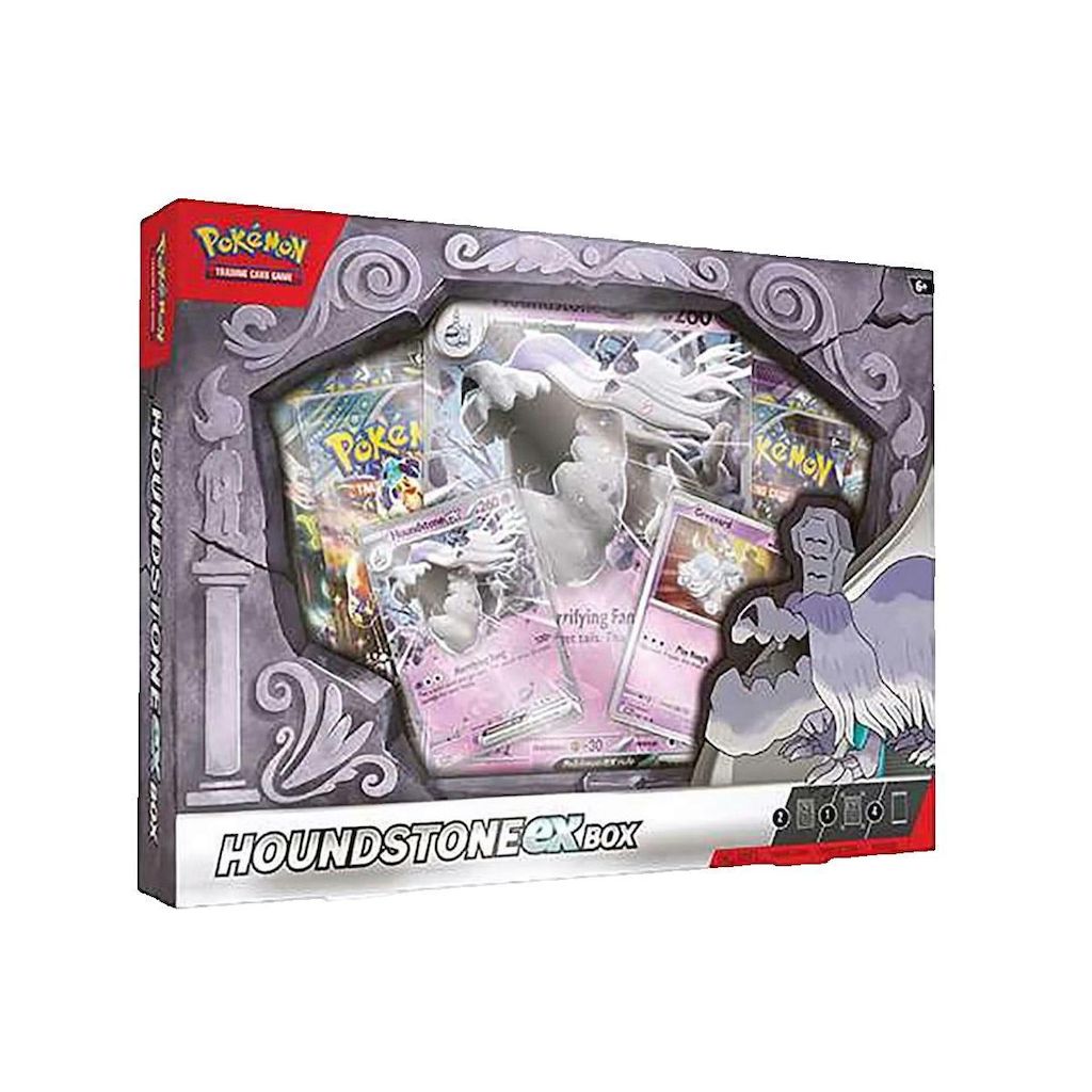 Découvrez le coffret Pokémon TCG Houndstone Ex qui inclut une carte promo foil Houndstone ex, une carte foil Greavard, et une grande carte foil Houndstone ex. Ce coffret multicolore propose des illustrations des personnages Pokémon et contient quatre boosters Pokémon TCG ainsi qu'un code pour jouer