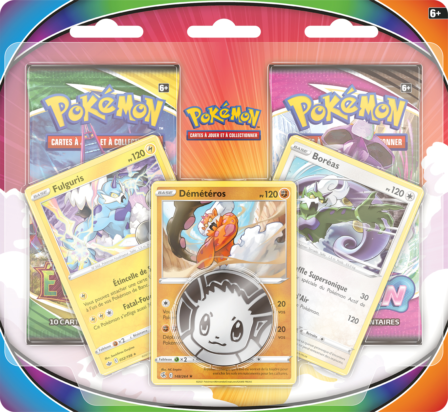 Enrichissez votre collection avec trois cartes brillantes du JCC Pokémon à l'effigie de Boréas, Fulguris et Démétéros. Ce pack booster contient également une pièce métallisée, deux boosters du JCC Pokémon et une carte à code pour le JCC Pokémon Live.