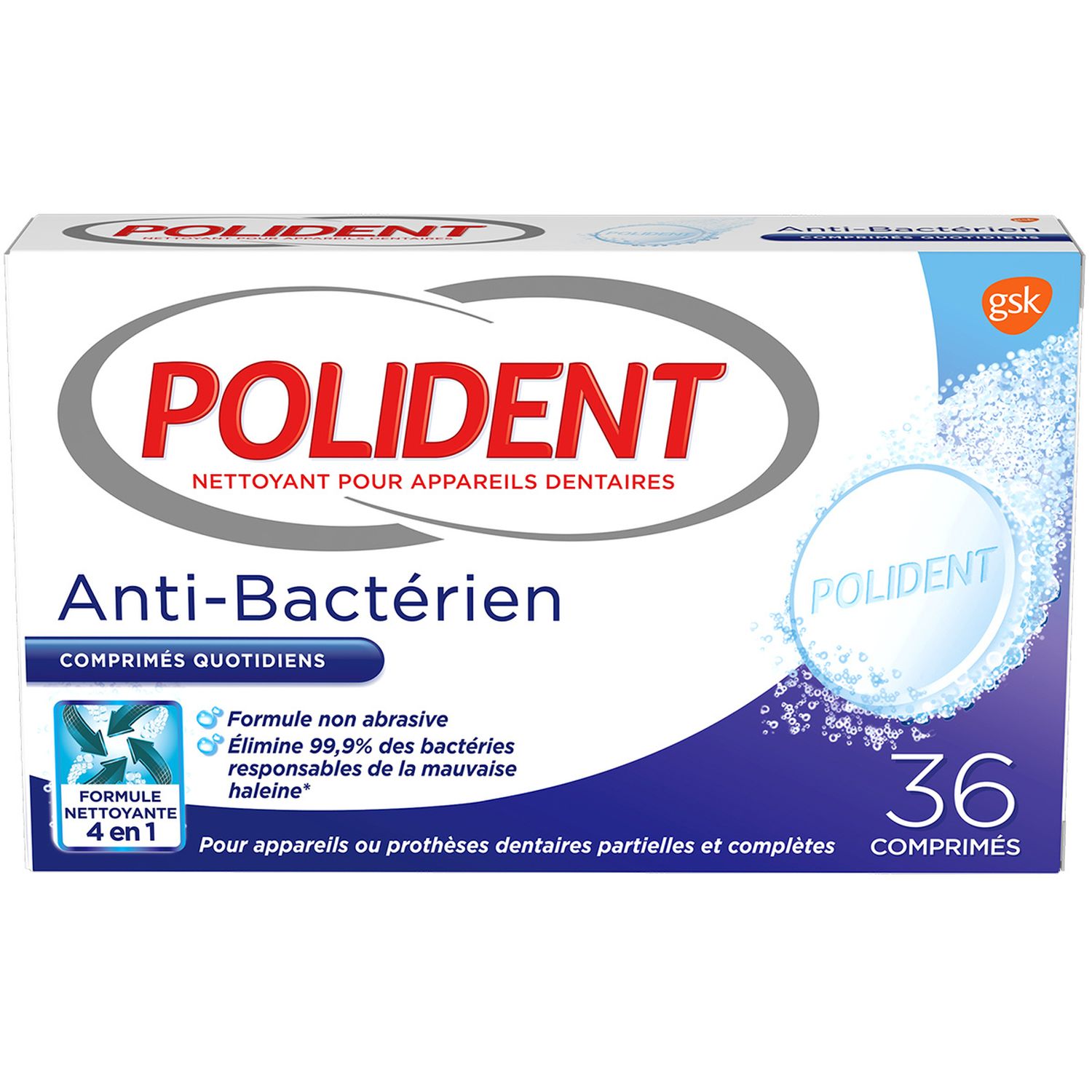 Polident Anti-Bactérien, comprimés nettoyants quotidiens pour prothèses dentaires partielles ou complètes.