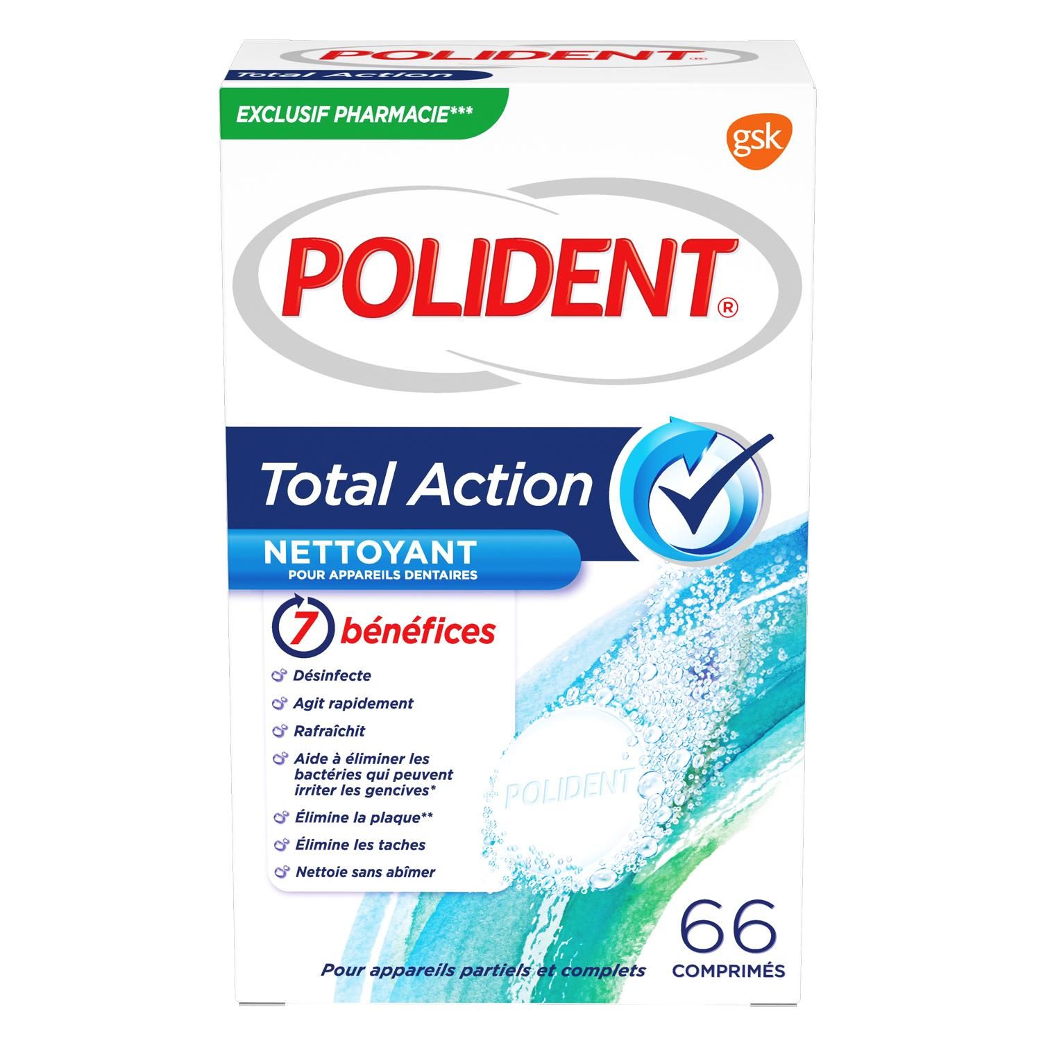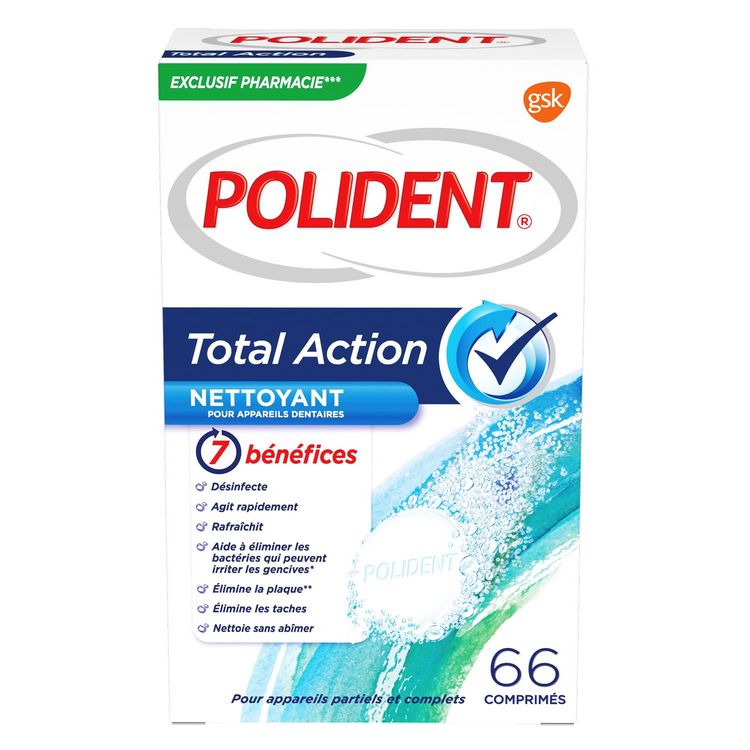 Polident Total Action, comprimés nettoyants quotidiens pour prothèses dentaires partielles ou complètes. Polident Total Action offre 7 bénéfices : désinfecte, agit rapidement, rafaîchit, aide à éliminer les bactéries qui peuvent irriter les gencives*, élimine la plaque**, élimine les taches, nettoie sans abîmer. La formule nettoyante 4 en 1 de Polident contient 4 agents qui agissent ensemble et aident à garder votre appareil le plus propre possible, tout en respectant ses composants. *Trempage uniquement, test en laboratoire **Lorsqu'utilisé comme indiqué