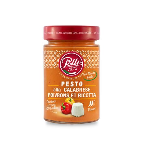 Ingrédients : Poivrons (origine Italie) 38%, huile de tournesol, FROMAGE RICOTTA FRAIS 12%, tomates, oignons, sel, FROMAGE GRANA PADANO AOP 2%, (contient OEUF), huile d'olive extra vierge 2%, FROMAGE PECORINO ROMANO AOP 1%, piment, origan, correcteur d'acidité : acide lactique.