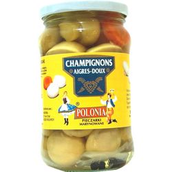 Produit obtenu à partir de champignons de Paris frais, blanchis et mis dans le vinaigre avec du sucre, du sel, des légumes et des épices. Stabilisé par la pasteurisation. CHAMPIGNONS AIGRES-DOUX 350G