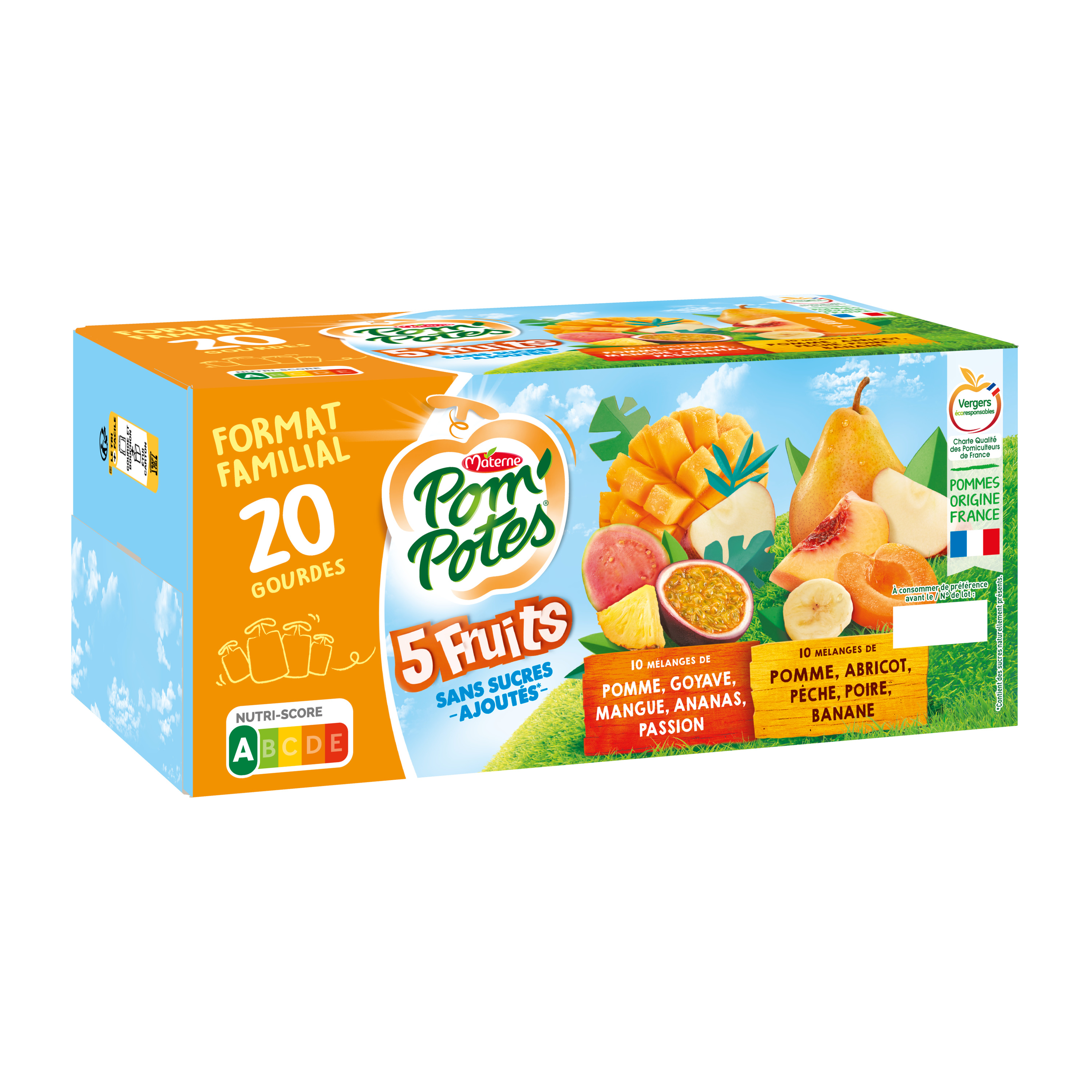 1,2,3,4 ... 5 fruits pour faire le plein de saveurs ! Découvrez la gamme Pom'Potes® 5 Fruits, des gourdes au goût intense à emporter partout ! Pom'Potes® 5 Fruits, c'est aussi : • Des recettes sans sucres ajoutés* et sans arôme artificiel • Une gourde Pom'Potes® correspond à 1 des 5 portions de fruits et légumes recommandées quotidiennement * Contient des sucres naturellement présents