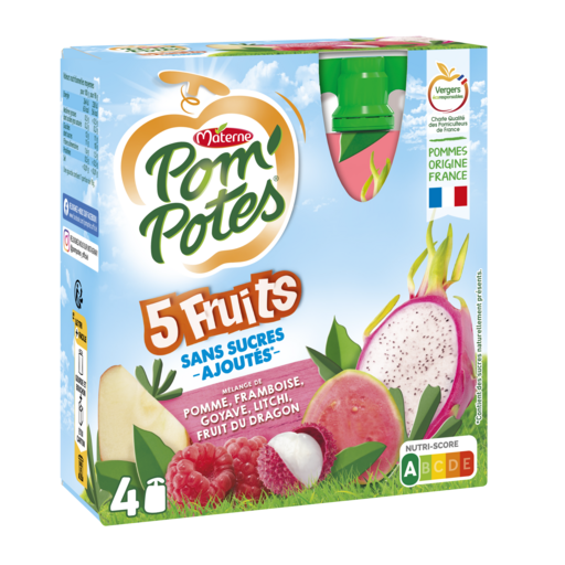 1,2,3,4 ... 5 fruits pour faire le plein de saveurs ! Découvrez la gamme Pom'Potes® 5 Fruits, des gourdes au goût intense à emporter partout ! Pom'Potes® 5 Fruits, c'est aussi : • Des recettes sans sucres ajoutés* et sans arôme artificiel • Une gourde Pom'Potes® correspond à 1 des 5 portions de fruits et légumes recommandées quotidiennement * Contient des sucres naturellement présents