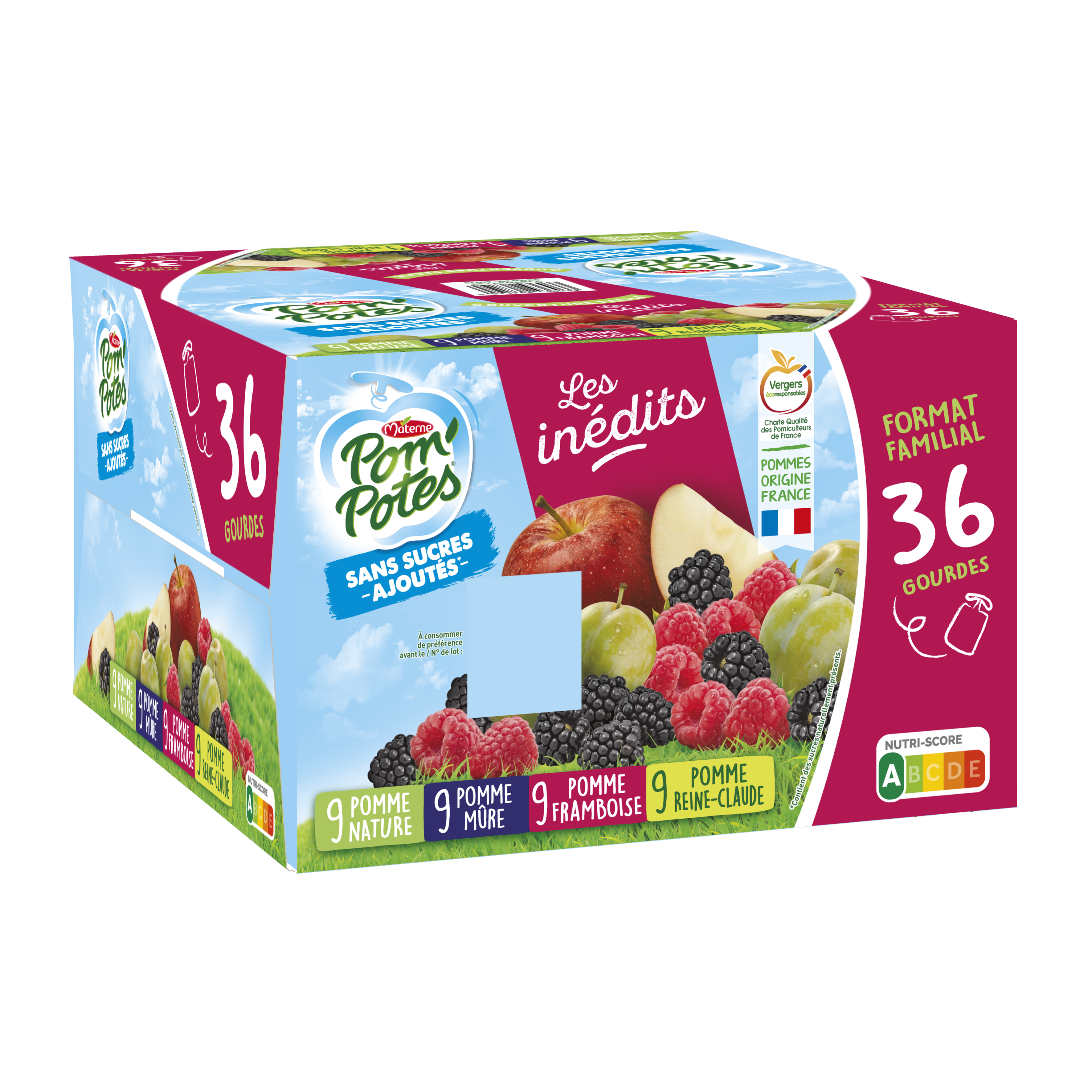 POM'POTES® Sans Sucres Ajoutés*, c'est le goûter à emporter partout, élaboré à partir de pommes origine France issues de Vergers écoresponsables. Chez POM'POTES®, on s'engage pour le bien-être et le plaisir des petits et des grands dégourdis ! Chacune de nos gourdes est sans sucres ajoutés* et correspond à 1 des 5 portions de fruits et légumes recommandées quotidiennement. * Contient des sucres naturellement présents.