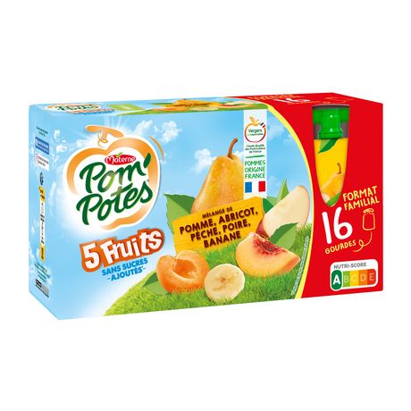 1,2,3,4 ... 5 fruits pour faire le plein de saveurs ! Découvrez la gamme Pom'Potes® 5 Fruits, des gourdes au goût intense à emporter partout ! Pom'Potes® 5 Fruits, c'est aussi : • Des recettes sans sucres ajoutés* et sans arôme artificiel • Une gourde Pom'Potes® correspond à 1 des 5 portions de fruits et légumes recommandées quotidiennement * Contient des sucres naturellement présents