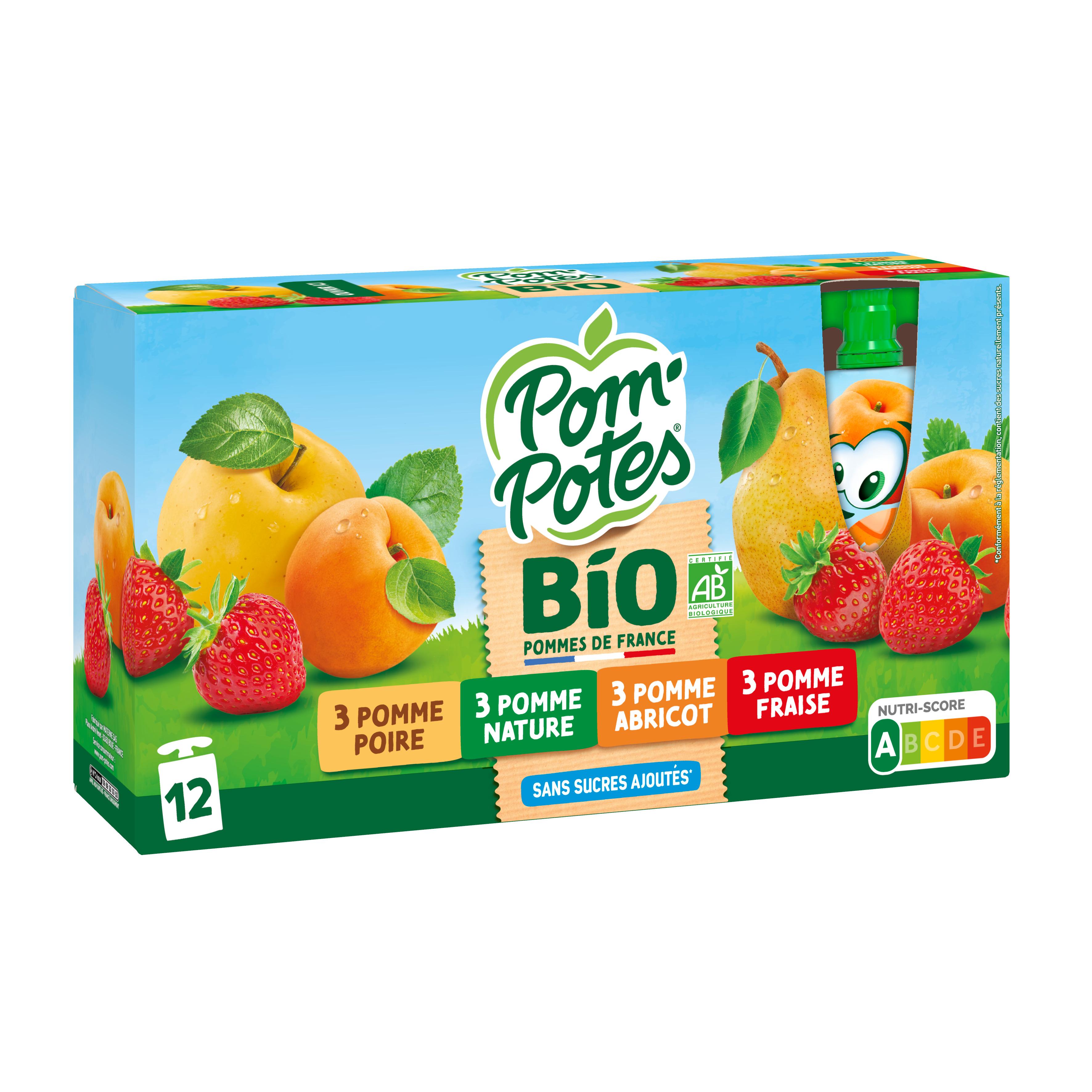 Pom'Potes® Bio, des recettes Bio et savoureuses ! Faites plaisir à vos enfants avec Pom'Potes® Bio, le goûter fruité et rigolo à emporter ! • Pom'Potes® Bio, ce sont des recettes savoureuses élaborées avec de bons fruits biologiques. Cocorico, nos pommes sont 100% Origine France ! • Pom'Potes® Bio s'engage pour un goûter sain : nos recettes sont sans sucres ajoutés (elles contiennent uniquement les sucres naturellement présents dans les fruits), Nutriscore A.