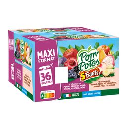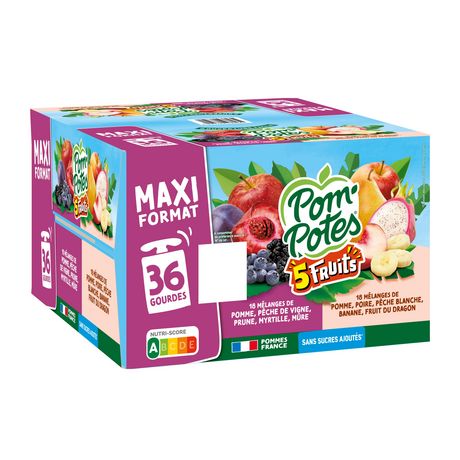 1,2,3,4 ... 5 fruits pour faire le plein de saveurs ! Découvrez la gamme Pom'Potes® 5 Fruits, des gourdes au goût intense à emporter partout ! Pom'Potes® 5 Fruits, c'est aussi : • Des recettes sans sucres ajoutés* Nutri-Score A • Une gourde Pom'Potes® correspond à 1 des 5 portions de fruits et légumes recommandées quotidiennement * Contient des sucres naturellement présents