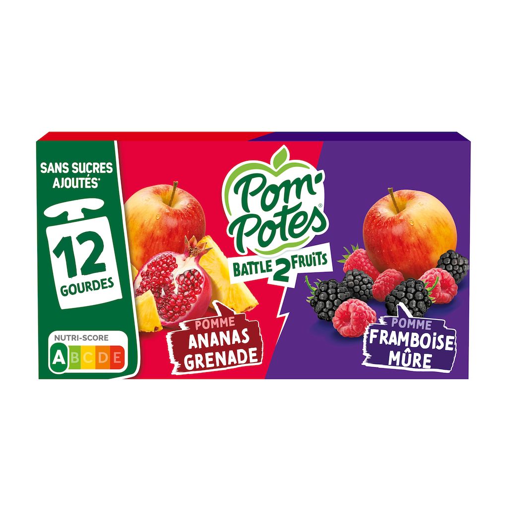 Découvrez Pom'Potes® Battle 2 fruits, des duos de recettes originales de 3 fruits qui vont vous en mettre plein la vue et les papilles. Partagez et départagez les avec vos proches, et pour ça rien de mieux de les goûter ! POM'POTES® Battle 2 Fruits, c'est aussi : • Des recettes sans sucres ajoutés*, sans arôme artificiel et sans colorant** • Une gourde Pom'Potes® correspond à 1 des 5 portions de fruits et légumes recommandées quotidiennement * Contient des sucres naturellement présents ** Conformément à la règlementation