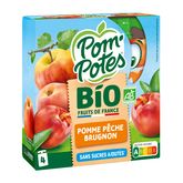 Pomme* origine France 79,7 %, pêche* origine France 15,0 %, brugnon* origine France 5,0 %, arôme naturel de pêche, jus de citron concentré* (si nécessaire pour réguler l'acidité), antioxydant : acide ascorbique. * issu de l'agriculture biologique.