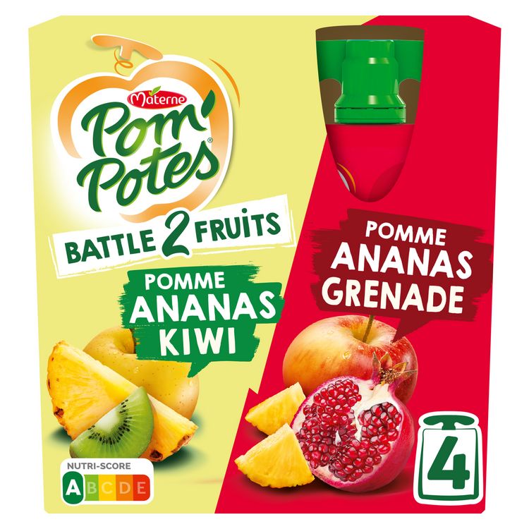 Découvrez Pom'Potes® Battle 2 fruits, des duos de recettes originales de 3 fruits qui vont vous en mettre plein la vue et les papilles. Partagez et départagez les avec vos proches, et pour ça rien de mieux de les goûter ! POM'POTES® Battle 2 Fruits, c'est aussi : • Des recettes sans sucres ajoutés*, sans arôme artificiel et sans colorant** • Une gourde Pom'Potes® correspond à 1 des 5 portions de fruits et légumes recommandées quotidiennement * Contient des sucres naturellement présents ** Conformément à la règlementation