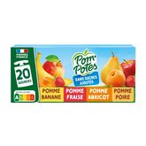 POMME : pomme origine France (purée, purée concentrée) 99,7 %, arôme naturel de pomme, jus de citron concentré (si nécessaire pour réguler l'acidité), antioxydant : acide ascorbique. POMME FRAISE : pomme origine France (purée, purée concentrée) 77,9%, fraise 22,0% , antioxydant : acide ascorbique. POMME POIRE : pomme origine France 64,8 %, poire 35,0%, arôme naturel, jus de citron concentré (si nécessaire pour réguler l'acidité), antioxydant : acide ascorbique. POMME ABRICOT : pomme origine France (purée, purée concentrée) 74,8%, abricot 25,0%, arôme naturel, jus de citron concentré (si nécessaire pour réguler l'acidité), antioxydant : acide ascorbique. POMME BANANE : pomme origine France 74,9 %, banane 25,0 %, jus de citron concentré (si nécessaire pour réguler l'acidité), antioxydant : acide ascorbique.