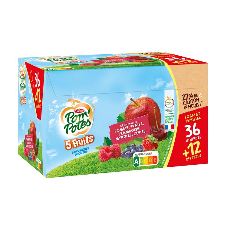 1,2,3,4 ... 5 fruits pour faire le plein de saveurs ! Découvrez la gamme Pom'Potes® 5 Fruits, des gourdes au goût intense à emporter partout ! Pom'Potes® 5 Fruits, c'est aussi : • Des recettes sans sucres ajoutés* et sans arôme artificiel • Une gourde Pom'Potes® correspond à 1 des 5 portions de fruits et légumes recommandées quotidiennement * Contient des sucres naturellement présents