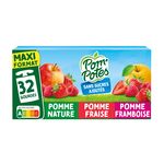 Pomme : pomme origine France 99,7% (purée et purée concentrée), arôme naturel de pomme, jus de citron concentré (si nécessaire pour réguler l’acidité), antioxydant : acide ascorbique. Pomme Fraise : pomme origine France 77,9% (purée et purée concentrée), fraise 22,0 %, antioxydant : acide ascorbique. Pomme Framboise : pomme origine France 79,9% (purée et purée concentrée), framboise 20,0 %, antioxydant : acide ascorbique.