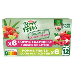 Pomme Fraise Citron Vert : pomme origine France (purée, purée concentrée) 83,4%, fraise 15,0%, jus de citron vert 1,5%, arôme naturel, antioxydant : acide ascorbique. Pomme Framboise Litchi : pomme origine France 79,7 %, framboise 15,0 %, litchi 5,0%, arômes naturels, jus de citron concentré (si nécessaire pour réguler l'acidité), antioxydant : acide ascorbique.