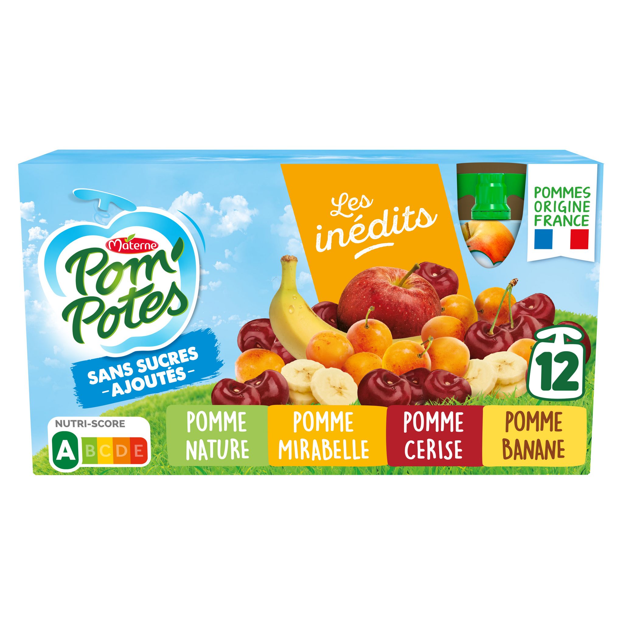 Spécialité de pomme sans sucres ajoutés (contient des sucres naturellement présents). Spécialité de pomme mirabelle avec arômes naturels sans sucres ajoutés (contient des sucres naturellement présents). Spécialité de pomme cerise avec arôme naturel sans sucres ajoutés (contient des sucres naturellement présents). Purée de pomme banane sans sucres ajoutés (contient des sucres naturellement présents).
