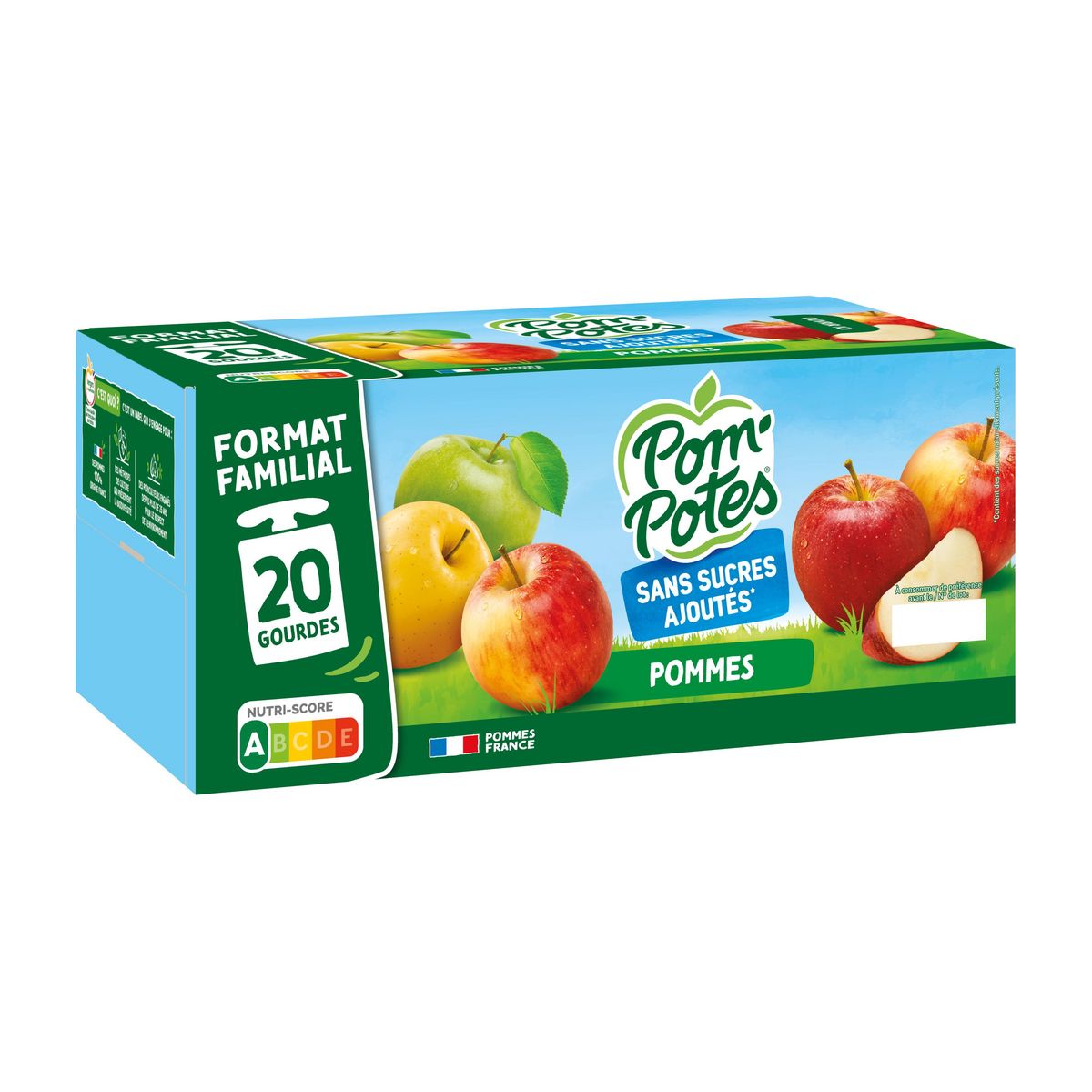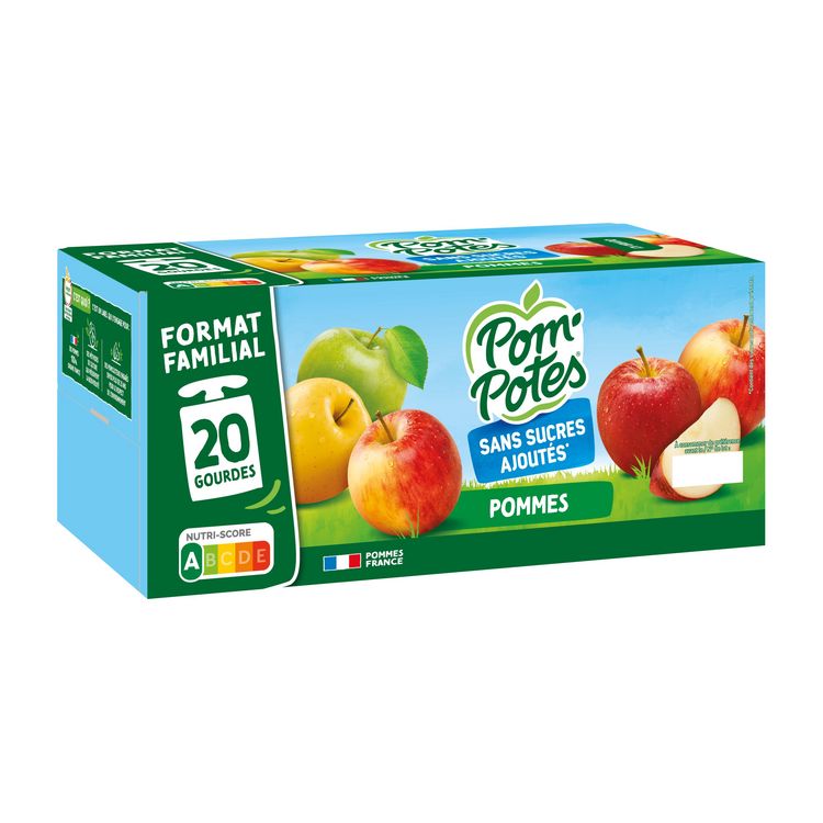 POM'POTES® Sans Sucres Ajoutés*, c'est le goûter à emporter partout, élaboré à partir de pommes origine France issues de Vergers écoresponsables. Chez POM'POTES®, on s'engage pour le bien-être et le plaisir des petits et des grands dégourdis ! Chacune de nos gourdes sont sans sucres ajoutés*, et correspondent à 1 des 5 portions de fruits et légumes recommandées quotidiennement. * Contient des sucres naturellement présents.
