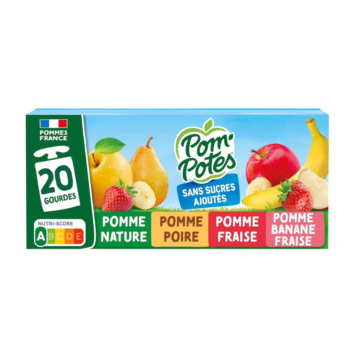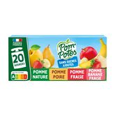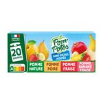 Pomme : pomme origine France 99,7% (purée et purée concentrée), arôme naturel de pomme, jus de citron concentré (si nécessaire pour réguler l’acidité), antioxydant : acide ascorbique. Pomme Poire : pomme origine France 64,8 % (purée et purée concentrée), poire 35,0 %, arôme naturel, jus de citron concentré (si nécessaire pour réguler l'acidité), antioxydant : acide ascorbique. Pomme Fraise : pomme origine France 77,9% (purée et purée concentrée), fraise 22 %, cassis, antioxydant : acide ascorbique. Pomme Banane Fraise : pomme origine France 69,9 %, banane 15,0%, fraise 15,0%, jus de citron concentré (si nécessaire pour réguler l’acidité), antioxydant : acide ascorbique.