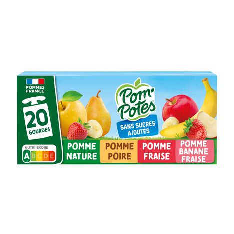 Spécialité de pomme sans sucres ajoutés (contient des sucres naturellement présents). Spécialité de pomme poire sans sucres ajoutés (contient des sucres naturellement présents). Spécialité de pomme fraise sans sucres ajoutés (contient des sucres naturellement présents). Purée de fruits sans sucres ajoutés (contient des sucres naturellement présents).