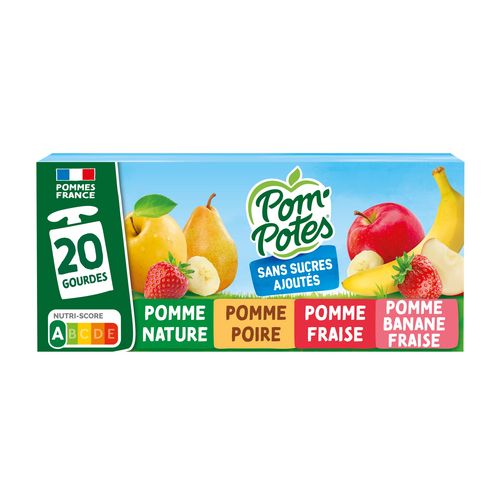 POM'POTES® Sans Sucres Ajoutés*, c'est le goûter à emporter partout, élaboré à partir de pommes origine France issues de Vergers écoresponsables. Chez POM'POTES®, on s'engage pour le bien-être et le plaisir des petits et des grands dégourdis ! Chacune de nos gourdes est sans sucres ajoutés* et correspond à 1 des 5 portions de fruits et légumes recommandées quotidiennement. * Conformément à la règlementation, contient des sucres naturellement présents.