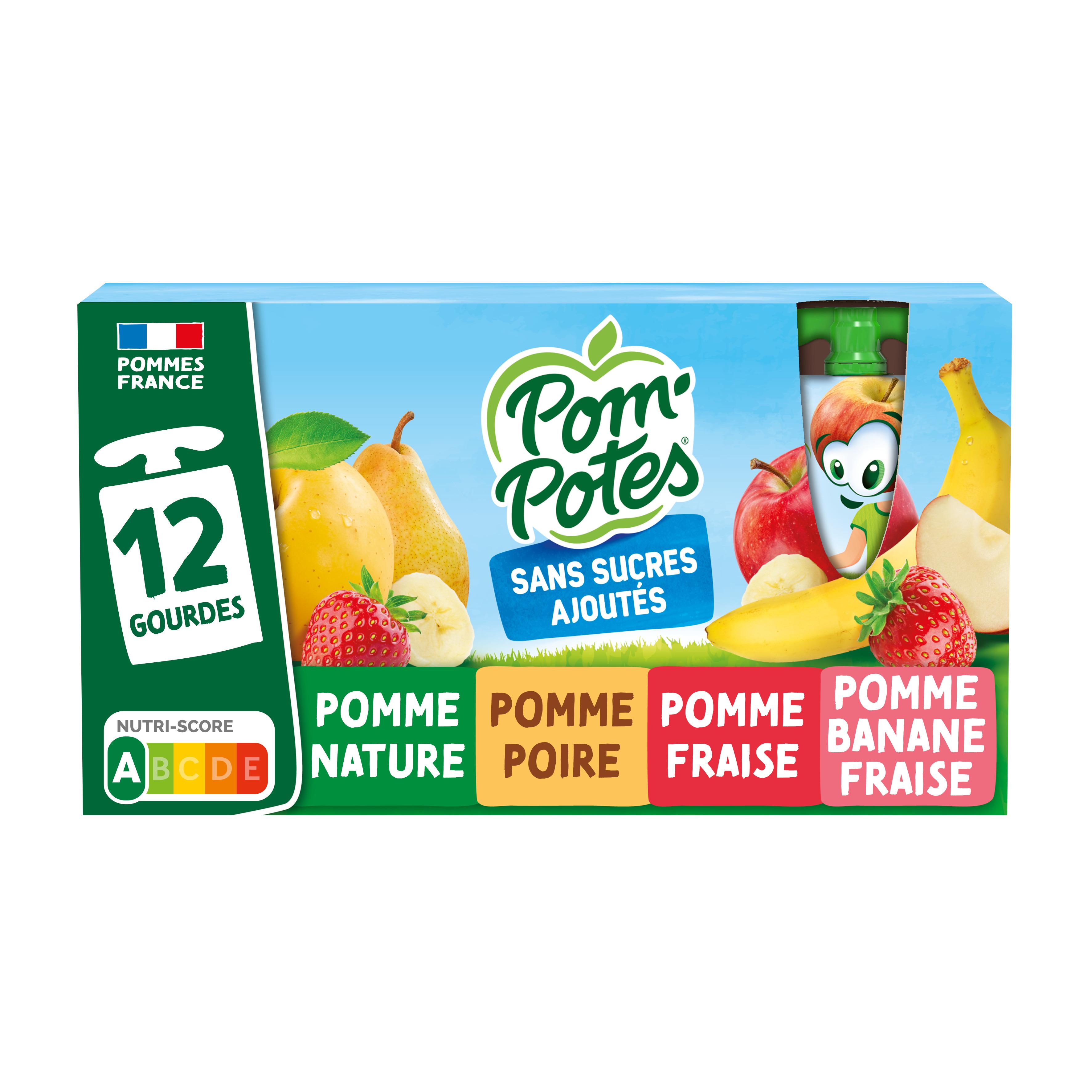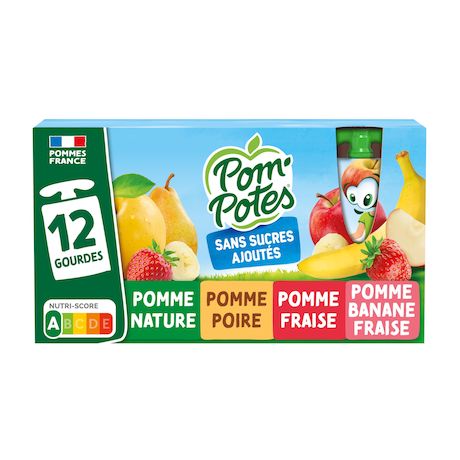 Spécialité de pomme sans sucres ajoutés (contient des sucres naturellement présents). Spécialité de pomme poire sans sucres ajoutés (contient des sucres naturellement présents). Spécialité de pomme fraise sans sucres ajoutés (contient des sucres naturellement présents). Purée de bananes sans sucres ajoutés (contient des sucres naturellement présents).