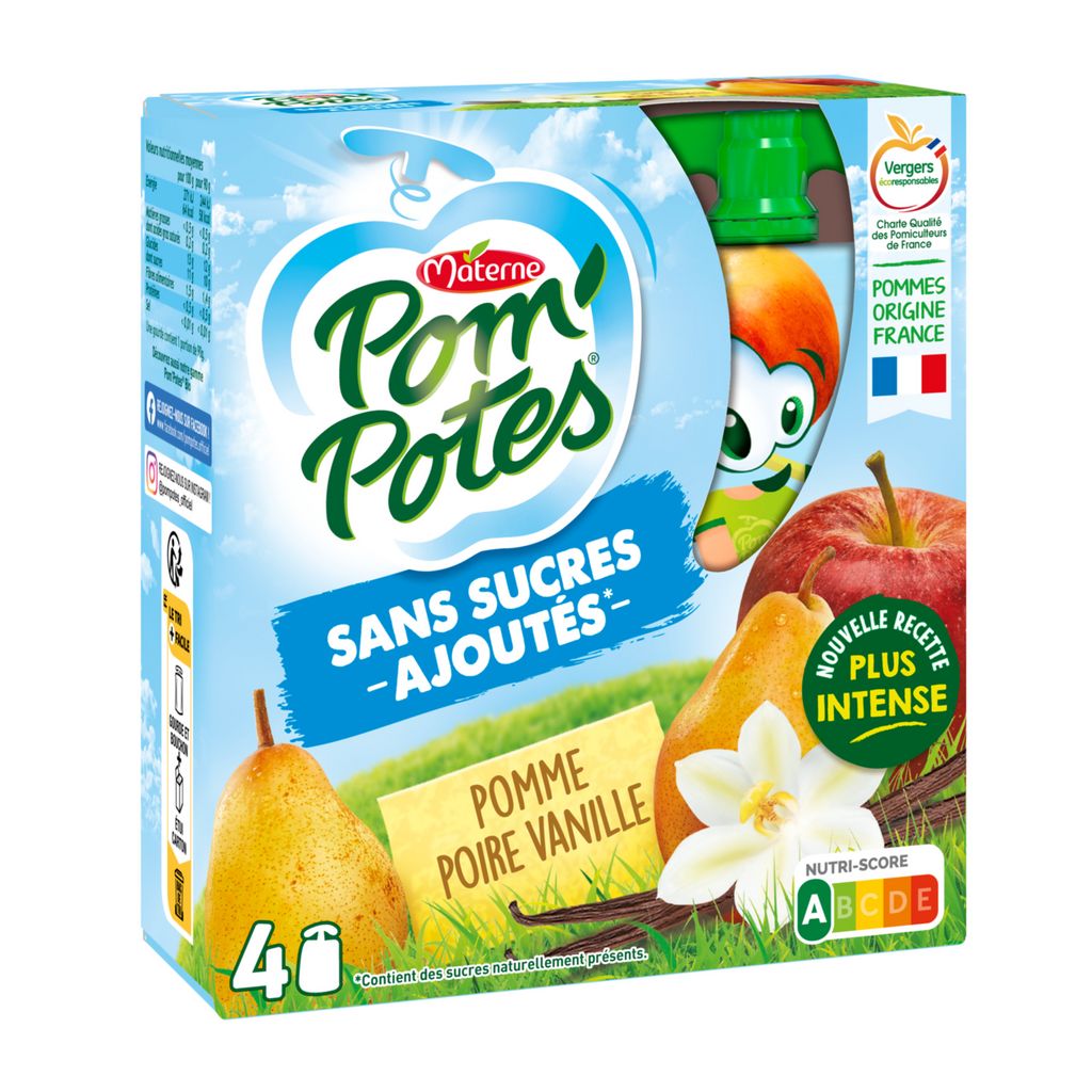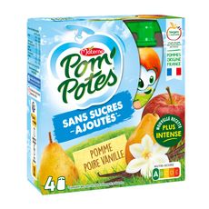 Pomme origine France (purée, purée concentrée) 79,4%, poire 20,0%, arôme naturel de vanille, arôme naturel, jus de citron concentré (si nécessaire pour réguler l'acidité), antioxydant : acide ascorbique.