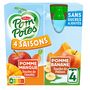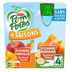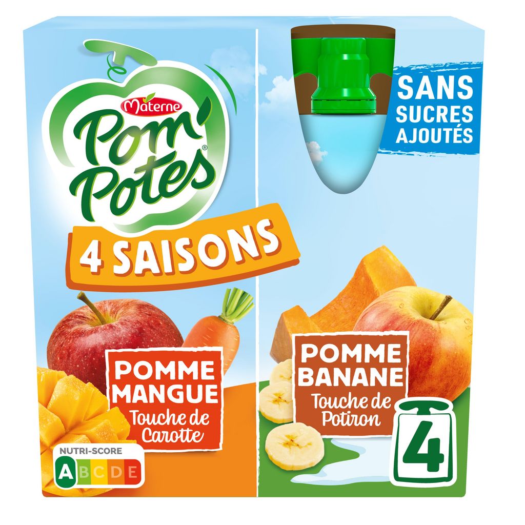 Découvrez Pom'Potes® 4 saisons, une gamme qui allie des fruits à une subtile touche de légumes d'une même saison pour faire découvrir le rythme de la nature à votre enfant de manière ludique et éducative. Pom'Potes® 4 saisons c'est : - Des fruits et des légumes frais récoltés à maturité et immédiatement mixés en compote pour profiter de leur bon goût toute l'année ; - Des jeux et anecdotes expliquant les spécificités et le rôle de chaque saison. Pom'Potes® 4 saisons, c'est aussi : - Des recettes sans sucres ajoutés* ; - Une gourde Pom'Potes® correspond à 1 des 5 portions de fruits et légumes recommandées quotidiennement. *Contient des sucres naturellement présents