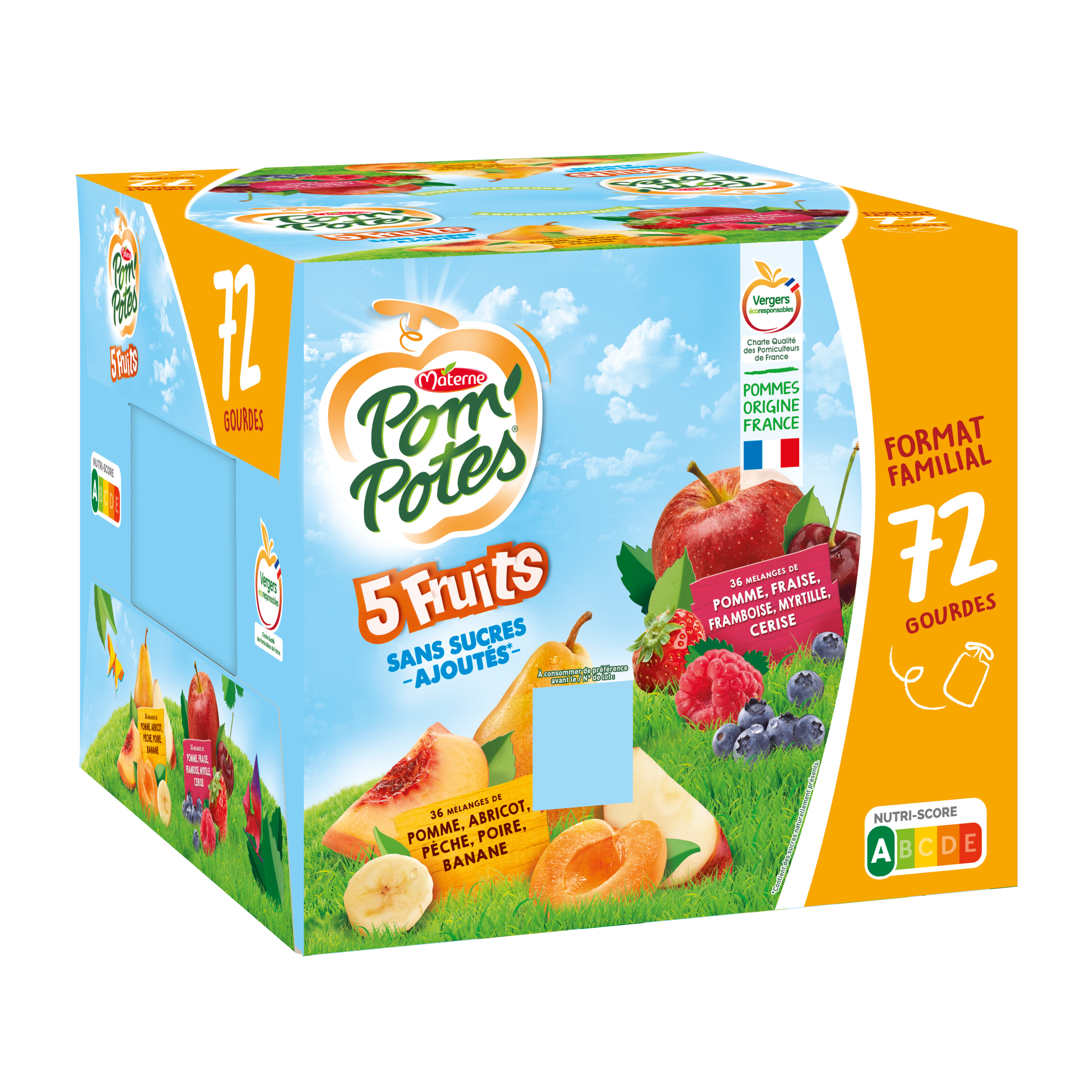 1,2,3,4 ... 5 fruits pour faire le plein de saveurs ! Découvrez la gamme Pom'Potes® 5 Fruits, des gourdes au goût intense à emporter partout ! Pom'Potes® 5 Fruits, c'est aussi : • Des recettes sans sucres ajoutés* et sans arôme artificiel • Une gourde Pom'Potes® correspond à 1 des 5 portions de fruits et légumes recommandées quotidiennement * Contient des sucres naturellement présents