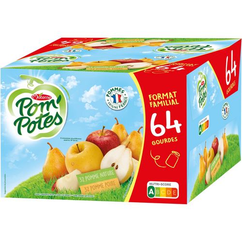 Compote de pomme allégée en sucres (30% de sucres en moins qu’une compote classique) Spécialité de pomme poire allégée en sucres (30% de sucres en moins qu'une compote classique) POM’POTES : Des gourdes à consommer à tout moment de la journée ! Pom’Potes s’engage pour une agriculture responsable tout en proposant des produits de qualité, dans le respect des règles de nutrition, pour le bien-être et le plaisir des enfants ! • Une gourde Pom’Potes correspond à 1 des 5 portions de fruits et légumes recommandées quotidiennement • Des recettes allégées en sucres* • L’origine française de nos pommes est garantie • Nos fournisseurs de pommes s’efforcent d’appliquer le principe de la « lutte intégrée », en réduisant au strict nécessaire le traitement des vergers • Des recettes sans conservateurs : une simple pasteurisation permet de conserver les gourdes à température ambiante sans ajout de conservateurs • Une ouverture facile des gourdes par les enfants avec l’Héli’Bouchon plus pratique * 30% de sucres en moins qu’une compote classique