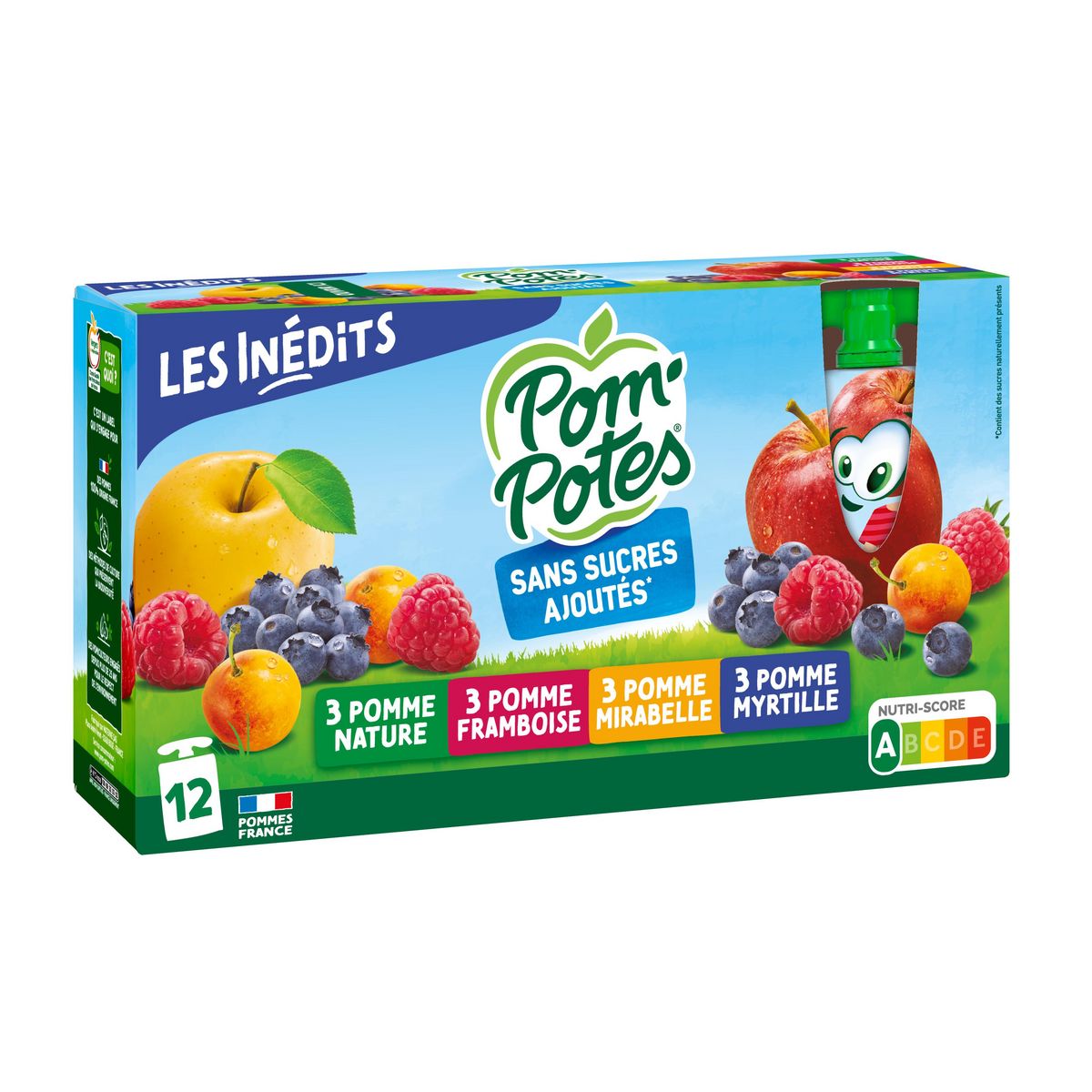 Pomme : pomme origine France (purée, purée concentrée) 99,7 %, arôme naturel de pomme, jus de citron concentré (si nécessaire pour réguler l'acidité), antioxydant : acide ascorbique. Pomme Mirabelle : pomme origine France 74,8%, mirabelle 25,0%, arôme naturel, jus de citron concentré (si nécessaire pour réguler l'acidité), antioxydant : acide ascorbique. Pomme Myrtille : pomme origine France (purée, purée concentrée) 79,9%, myrtille 20,0%, arôme naturel, antioxydant : acide ascorbique. Pomme Framboise : pomme origine France (purée, purée concentrée) 79,9%, framboise 20,0%, antioxydant : acide ascorbique.