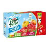 Pomme : pomme 99,7% (purée et purée concentrée), arôme naturel de pomme, jus de citron concentré (si nécessaire pour réguler l'acidité), antioxydant : acide ascorbique. Pomme Fraise : pomme 77,9% (purée et purée concentrée), fraise 22,0 %, antioxydant : acide ascorbique. Pomme Framboise : pomme 79,9% (purée et purée concentrée), framboise 20,0 %, antioxydant : acide ascorbique.