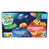 Pomme Mûre Myrtille : pomme origine France (purée, purée concentrée) 79,9%, mûre 15,0%, myrtille 5,0%, arômes naturels, antioxydant : acide ascorbique. Pomme Abricot Brugnon : pomme origine France 79,8%, brugnon 13,0%, abricot 7,0%, arômes naturels, jus de citron concentré (si nécessaire pour réguler l'acidité), antioxydant : acide ascorbique.