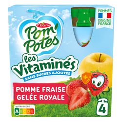 Pomme origine France (purée, purée concentrée) 77,6 %, fraise 22,0 %, gelée royale 0,2 %, vitamines (A, B6, C).