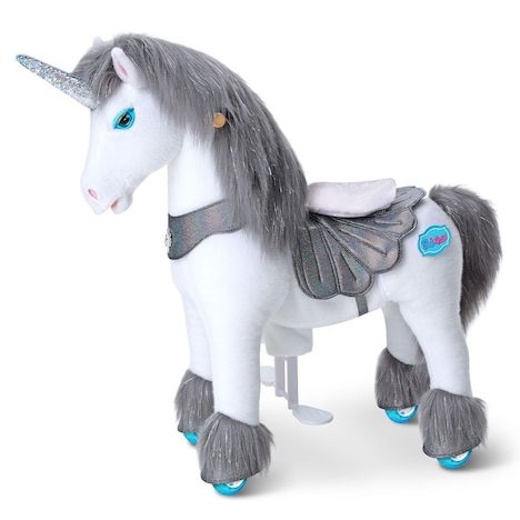 PonyCycle Cheval Licorne Gris Modèle Avancé Y (Hauteur 90 cm, pour enfants de 4 à 7 ans) Poney à Roulettes, Cadeau d'Anniversaire de Noël pour Enfants Poney Marcheur en Peluche Y456