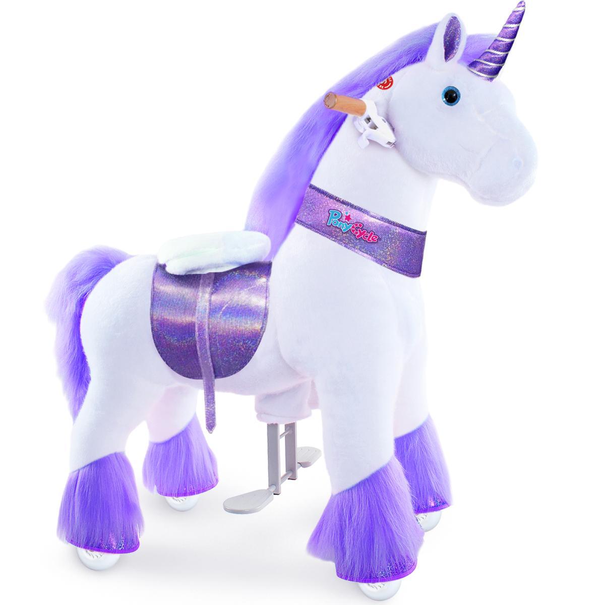 Les enfants n'ont qu'à monter et descendre avec leurs pieds sur les pédales pour chevaucher cette licrone. Il n'y a pas besoin de piles ou d'électricité : il suffit de se lever et de s'abaisser sur la selle pour faire avancer les jambes et la tête de la licorne, créant ainsi un mouvement de galop qui propulse le PonyCycle®. Utilisez les poignées situées de chaque côté de la tête pour guider la licrone dans la bonne direction. Le Pony Cycle est une nouvelle façon amusante d'améliorer l'équilibre et la coordination et de rendre les enfants actifs. Les poignées en bois offrent au cavalier une stabilité et une sécurité supplémentaires, tout en ajoutant une touche traditionnelle à un cheval révolutionnaire. Le PonyCycle® Ride On est équipé d'un siège en similicuir et d'un harnais en similicuir. Des tissus en peluche de haute qualité donnent à cette licrone une finition douce et confortable. La crinière et la queue peuvent être brossées, ce qui permet aux enfants de toiletter et de prendre soin de la licrone pendant leurs jeux d'imagination. Grâce à ses 4 roues qui glissent facilement, le PonyCycle® Ride On peut être utilisé à l'intérieur comme à l'extérieur sur un sol plat. Vous pouvez faire la course devant les chevaux à bascule stationnaires avec le Pony Cycle. Dimensions :85x39x90 4 à 8 ans 25 kg max