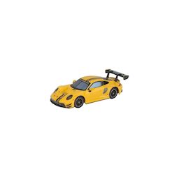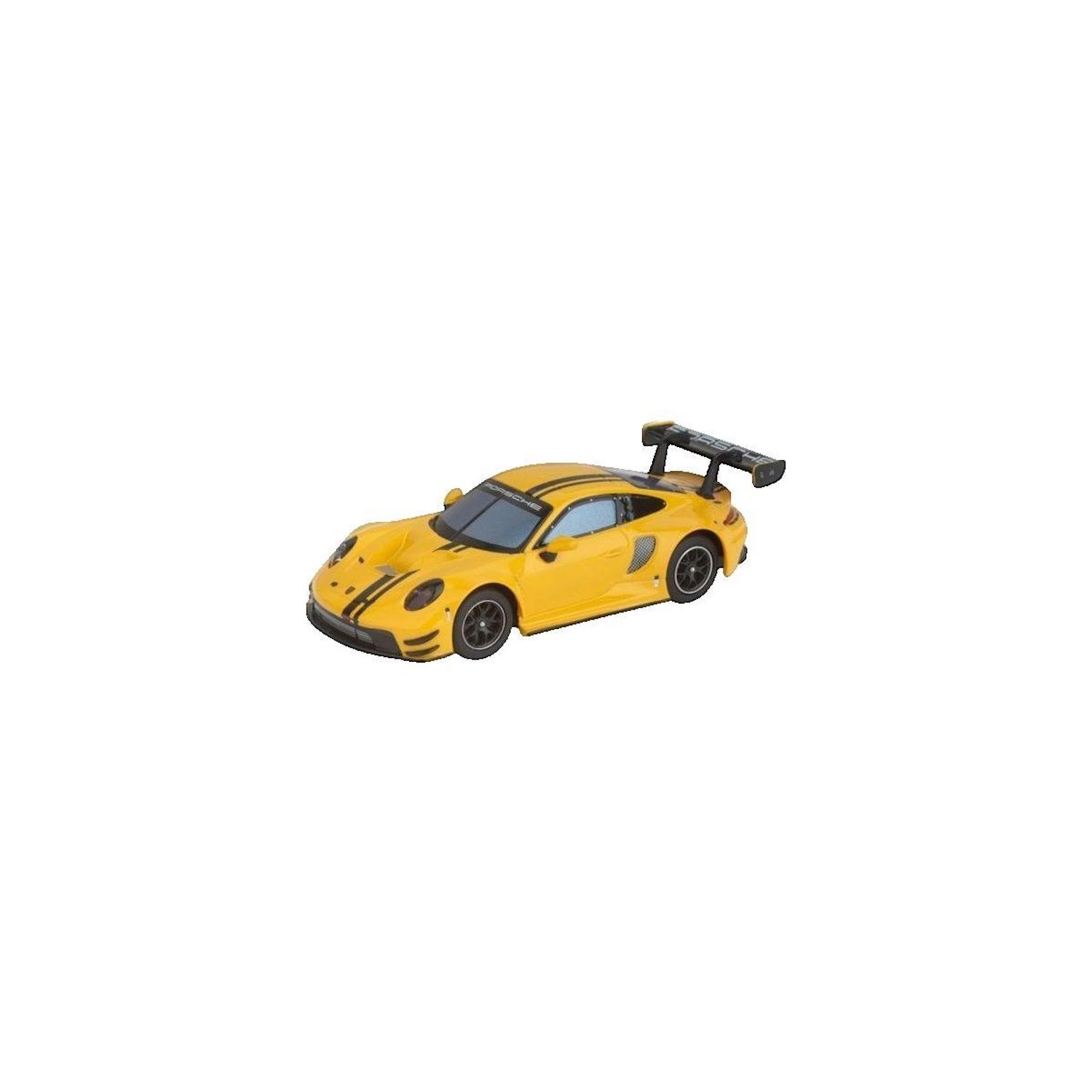 La petite voiture Carrera-Hybrid Porsche 911 GT3 R Grello est un modèle hybride à l'échelle 1:50 en plastique jaune. Ce véhicule de course dispose de lumières fonctionnelles et d'un contrôle par application. Il est équipé d'une batterie rechargeable offrant 30 minutes de fonctionnement après seuleme