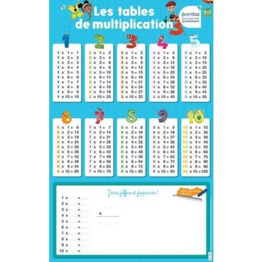 Une collection unique de posters effaçables pour apprendre en s'amusant ! Ce poster effaçable propose d'apprendre ou de revoir les tables de multiplication de façon originale et amusante. Grâce à une partie effaçable en bas du poster, l'enfant pourra s'entraîner librement avec un feutre effaçable (non fourni) autant de fois qu'il le veut ! Avec un look moderne et des illustrations originales , ce poster deviendra vite une aide précieuse pour l'enfant dans ses premiers apprentissages. Mesurant 45x72 cm , ce poster trouvera sa place sur les murs de la chambre de l'enfant, dans la salle de jeu, dans la salle de alte ou dans n'importe quelle pièce de la maison : une décoration amusante et pratique pour l'apprentissage des tables de multiplication ! Imprimé en France