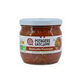 Ingrédients : "Courgette* 23%, purée de tomate* 23%, aubergine* 23%, oignon*, poivron* 12%, huile d'olive*, ail*, sel de Guérande, concentré de tomate*, basilic*, thym*, romarin*, paprika*, poivre*.