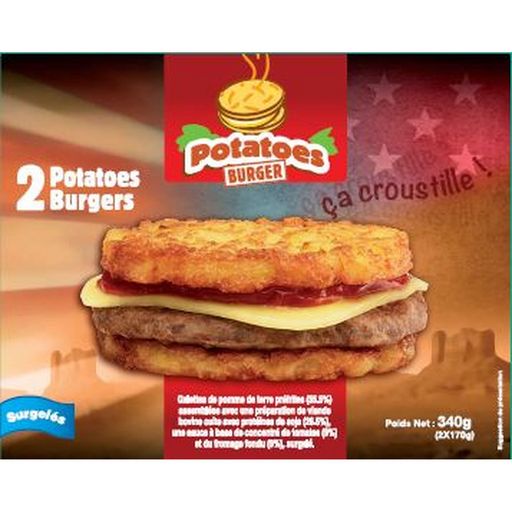 Galettes de pomme de terre préfrites (55.5%) assemblées avec une préparation de viande bovine cuite avec protéines de soja (26.5%), une sauce à base de concentré de tomates (9%) et du fromage fondu (9%), surgelé.
