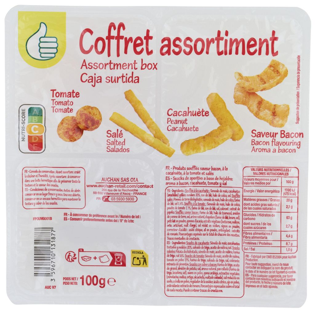 Ingrédients : Soufflés à la cacahuète : Semoule de maïs, cacahuètes (arachides) grillées moulues 20%, son de blé, huile de colza, sel.Soufflés salés : Pomme de terre déshydratée, semoule de maïs, huile de colza, farine de blé, sel 1,6%. Soufflés à la tomate : Semoule de maïs, huile de colza, poudre de tomate 7,7%, farine de blé, son de blé, sel, colorant : extrait de paprika. Soufflés saveur bacon :Farine de blé, huile de tournesol, amidon de pomme deterre, sel, arôme naturel, chapelure (farine de blé, levure, sel), petit-lait en poudre,gomme d’acacia, extraits végétaux (betterave, mélisse, ortie, artichaut, malt d’orge), sel réduit en sodium,oignon en poudre, correcteur d’acidité : acide citrique, ail en poudre,antioxydant : extraits de romarin.Pourcentages exprimés sur le total de chacune des recettes.Traces éventuelles de crustacés.