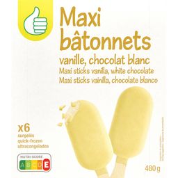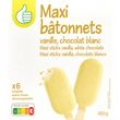 Bâtonnets de glace saveur vanille 71% avec enrobage de chocolat blanc 29%, surgelés