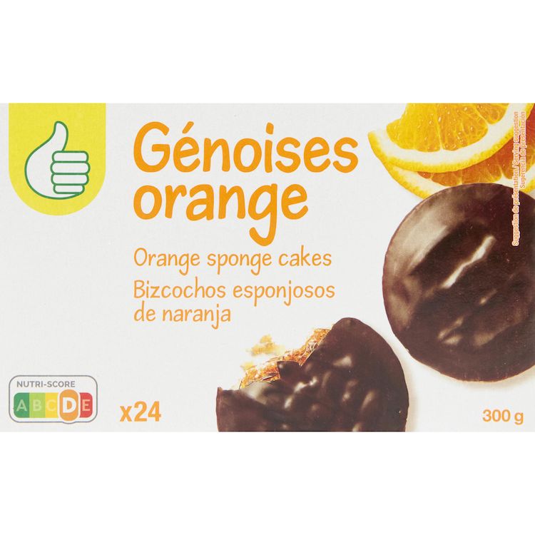 Génoises fourrées à l'orange (55%) et nappées de chocolat noir (15%)