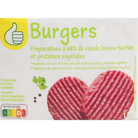 Préparations à 48% de viande bovine hachée et protéines végétales, surgelées.