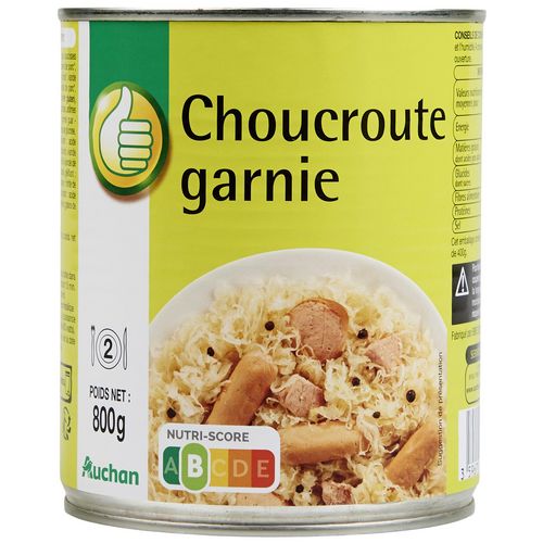 Ingrédients : Choucroute 50%, eau, saucisses et saucisson fumés 15% (gras et couenne de porc *, eau, viande séparée mécaniquement de dinde*, viande de porc*, viande séparée mécaniquement de porc *, amidon de pois, protéines de BLÉ, plasma de porc, sel, stabilisant : triphosphates, gélifiants : carraghénanes - gomme guar - gomme xanthane, arôme naturel de poivre, coriandre en poudre, sirop de glucose, colorant : extrait de paprika, arôme naturel d'ail, antioxydant : acide ascorbique, arôme naturel de muscade), viande de porc traitée en salaison et précuite 6% (viande de porc *, eau, sel, stabilisant : triphosphates, gélifiant : algues Euchéma transformées), saindoux, vin blanc, sel, baies de genièvre, antioxydant : acide ascorbique, grains de poivre, arôme naturel de poivre. Traces éventuelles de lait. * Origine: UE Pourcentages exprimés par rapport au poids net total.