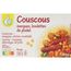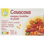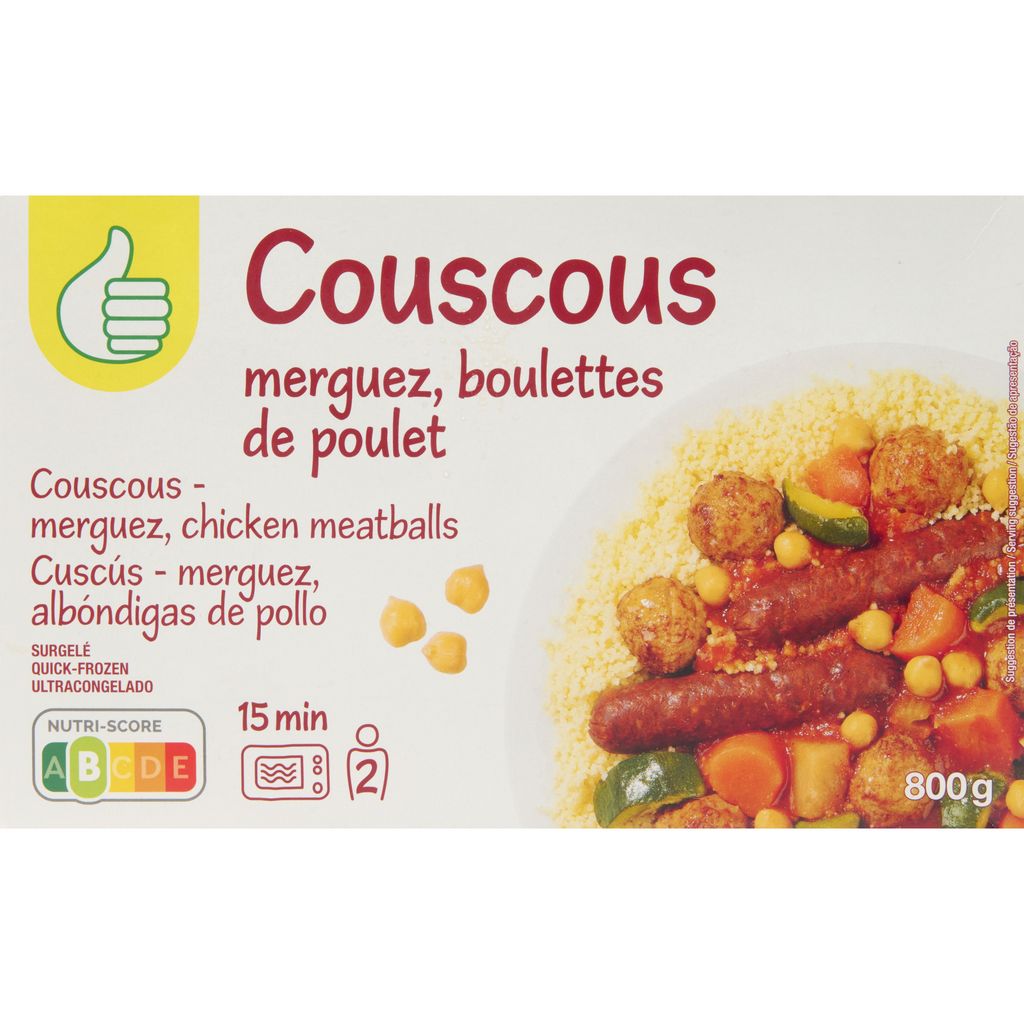 Légumes 28,7% accompagnés de semoule de couscous déshydratée 20%, de jus cuisiné, de merguez et de boulettes au poulet, surgelés