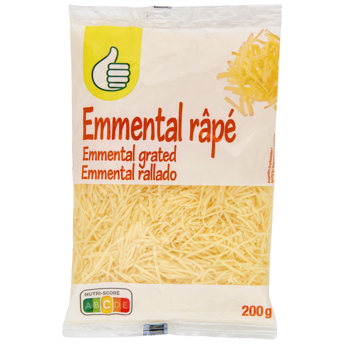 Ingrédients : Emmental 98% (Lait de vache pasteurisé, sel, ferments lactiques [lait], coagulant microbien), antimottant : fécule de pomme de terre 2%.Élaboré à partir de lait origine UE.